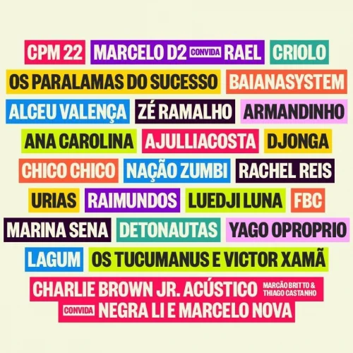 Olha esse Line Up: BaianaSystem, Alceu Valença, Ana Carolina,Raimundos, FBC, Nação Zumbi, Lagum e Djonga, CPM 22, Detonautas, Os Paralamas do Sucesso,Armandinho, Criolo, Zé Ramalho, Marina Sena, Marcelo D2 e Rael,"Charlie Brown Jr. Acústico"com...
